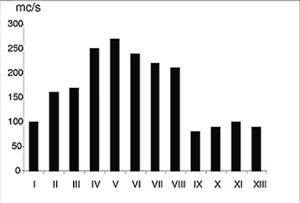 Analizati diagrama in coloane care prezinta evolutia debitelor medii lunare ale