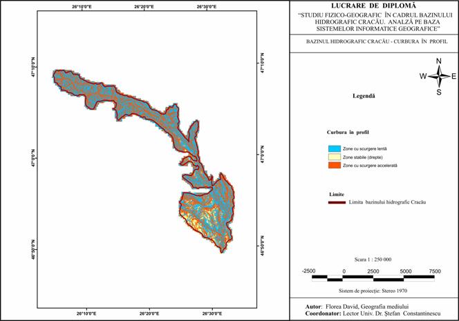 Harta Curburii in Profil este foarte importanta pentru ca aceasta determina care sunt suprafetele convexe si care sunt suprafetele concave. Pe versantii convecsi se manifesta o scurgere accelerata (marcata pe harta prin valori negative), in timp ce pe versantii concavi manifesta o scurgere decelerata (valori pozitive). Astfel, zonele cu curgere accelerata sunt predominante, in special in arealele superioare si mijlocii ale bazinului. Se identifica si numeroase zone cu curgere lenta printre cele cu scurgere accelerata din cauza ca exista formatiuni calcaroase, acestea retinand apa, ajungandu-se in unele zone la secarea cursului de apa. In zona inferioara apar deja si areale cu scurgere stabila, in special aproape de gura de varsare.