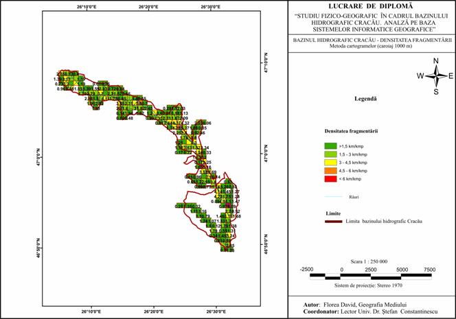 Harta densitatii fragmentarii reliefului exprima gradul de fragmentare raportat la unitatea de suprafata. Reteaua hidrografica este masurata si aceasta se raporteaza la suprafata bazinului. Rezultatul este in km/km2. Reteaua hidrografica nu este una foarte bogata in bazinul Cracaului, aceasta avand o valoare de 1,5-3 km2 aproape in intregul areal. In sectorul mijlociu, in care cativa afluenti se varsa in Cracau si datorita maririi albiei, densitatea retelei hidrografice este mai mare, aceasta avand si valori de 3-4,5, 4,5-6 si chiar mai mare. In aceasta harta a avut loc o eroare tehnica si sunt reprezentate in principal numai arealele cu retea hidrografica.