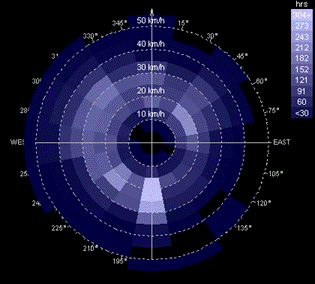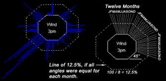 O diagrama octogonala, fiecare directie avand 12 linii ce corespund celor 12 luni ale anului dispuse pe digrama in sensul acelor de ceasornic. Fiecare linie reprezinta procentul din timpul fiecarei luni in care vantul bate din cele 8 directii.