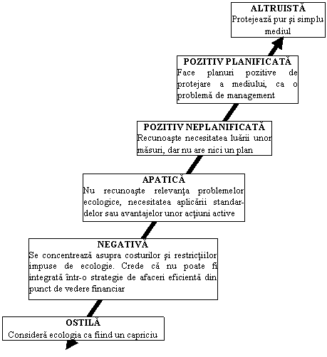 Atitudinea conducerii fata de mediu se poate intinde de la altruism la ostilitate. Unii directori incep a avea o atitudine apatica sau defensiva. Odata ce obiectiile lor au fost discutate, directorii devin pozitivi. In fig.3 sunt prezentate cele 6 categorii de atitudini, din care rezulta ca atitudinile extremiste („ostil“ si „altruist“) sunt periculoase si distructive. Categoriile de apatic si „pozitiv neplanificat“ tind sa fie neproductive. Se considera ca atitudinea de „pozitiv planificat“ este cea mai buna pentru ca, presupune disciplina in actiunile sale.