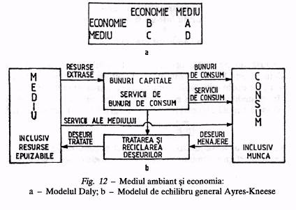 Contrar externalitatilor economice care erau potential "internalizate" într-un fel sau altul, externalitatile mediului ambiant sunt produse atât timp cât exista bunuri economice si servicii, iar în final toate externalitatile sunt practic înglobate în economia generala. O tentativa timpurie de formulare a acestei probleme pare a fi modelul Daly (1968), model input-output cu figurarea unor relatii de baza între principalele elemente: economie si mediu (fig. 12).