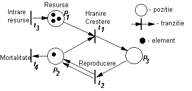 Un rationament similar se aplica pentru cazul īn care este declansata tranzitia t2. Tranzitiile t1 si t2 reprezinta procesele de hranire si crestere, respectiv reproducere.