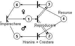 Prin acest rationament, retelele Petri pot fi utilizate pentru a simula procese ecologice mult mai complexe care presupun studiul relatiilor interspecifice sau intraspecifice. Un alt exemplu, construit pentru o populatie cu reproducere sexuata, este prezentat īn figura 63.