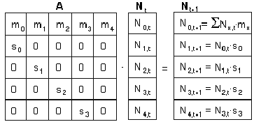 Prima ecuatie reprezinta dezvoltarea si mortalitatea si specifica numarul de organisme din toate clasele de vārsta, iar cea de a doua descrie procesul de reproducere si specifica numarul de indivizi din prima clasa de vārsta.