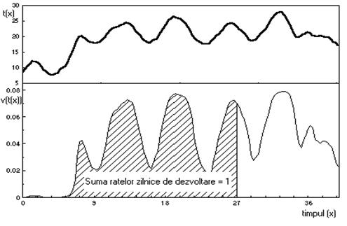 Daca temperatura este reprezentata īn functie de timp, ca īn graficul din figura 49, atunci, īn fiecare moment, rata dezvoltarii este estimata ca o functie neliniara de timp. Integrala functiei v(t(x)), care reprezinta aria de sub traiectoria temperaturii, īn intervalul (0, T) trebuie sa fie egala cu unitatea.