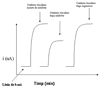 mL de tampon de lucru ce contine tiocolina 3 mM sunt adaugati pe electrod si se înregistreaza curentul (aproximativ 80 nA). Curentul obtinut ce se datoreaza oxidarii ticolinei se obtine facând diferenta dintre curentul înregistrat în etapa 2 minus cel înregistrat în etapa 1. Valoarea obtinuta corespunde enzimei neinhibate (I0).
