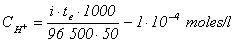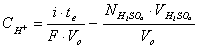 unde: i = curentul de electroliza īn amperi; te = timpul de electroliza la punctul de echivalenta (secunde); F = constanta Faraday (coulombi/mol); Vo = volumul initial de proba (litri); NH2SO4 = normalitatea acidului sulfuric adaugat; VH2SO4 = volumul de acid sulfuric adaugat (litri)
