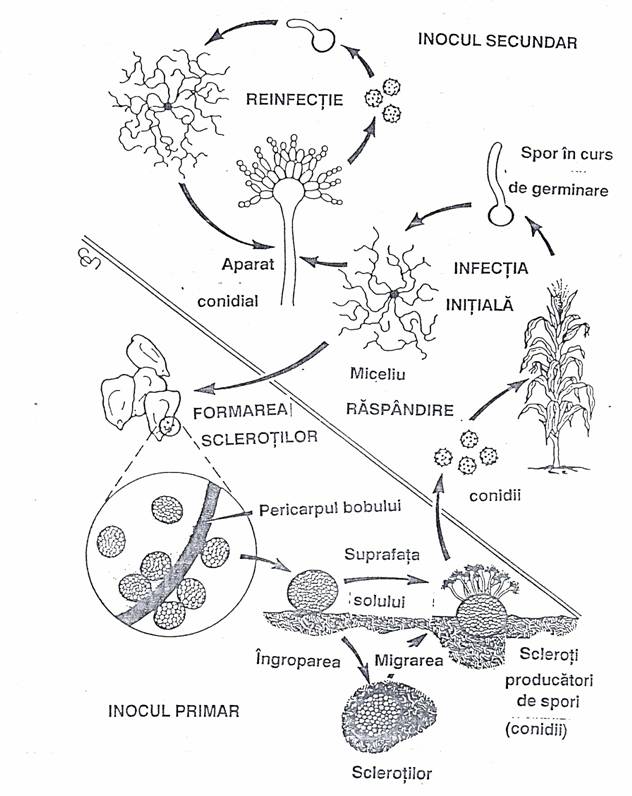 Fig. 2. Ciclul de viata al ciupercilor aflatoxigene din grupul Aspergillus section flavi (A. flavus, A. parasiticus, A. nomius, A. bombycis si A. pseudotamarii).