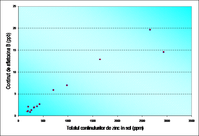 Fig. 3. Relatia dintre poluarea cu zinc si continutul de aflatoxine in porumbul crescut pe parcele poluate