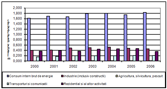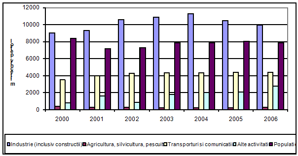 De asemenea, consumul in agricultura, silvicultura si pescuit a crescut in 2006 cu 25 mii tep fata de anul anterior, in transporturi si comunicatii a crescut cu 28 mii tep, in timp ce la populatie se remarca o scadere a consumului cu 166 mii tep in anul 2006 fata de anul 2005. Evolutia consumului final energetic in perioada 2000 – 2006 este redat in figura nr. 2.2.