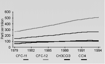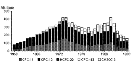 Productia de substante care pot afecta ozonul atmosferic a inceput sa descreasca semnificativ, cel putin in SUA, din 1988 pentru ca in prezent sa atinga nivele similare cu cele de acum 30 ani. Datorita acordurilor internationale pentru reducerea productiei si utilizarii acestor substante pana le eliminarea lor totala, concentratia exprimata prin clor echivalent a productiei mondiale de CFC care a inregistrat valori maxime in anii 1992 si 1993 (Fig. 55) este actualmente in scadere.