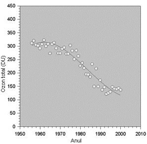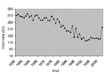 concentratiei de ozon deasupra Antarcticii in perioada 1956-2001 (dupa J.D.