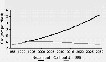 Figura 59 . Impactul Protocolului de la Montreal asupra concentratiei clorului in stratosfera.