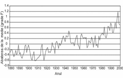 Valoarea medie globala a temperaturii la suprafata Pamantului a crescut cu 0,5-1,00F de la sfarsitul secolului 19 pana in prezent (Fig. 60 ). Ce mai calzi 10 ani din secolul 20 s-au inregistrat in ultimii 15 ani ai secolului trecut, recordul fiind inregistrat in 1998 cand s-a observat in emisfera nordica o scadere a suprafetei acoperite cu zapada si o reducere a cantitatii de gheata specifice Oceanului Arctic.