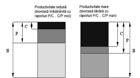 Fig. 24. Prezentarea schematica a relatiei dintre productivitate (P/B), raport de consum (C/P) si vârsta medie a biomasei (B - biomasa; P - productia neta; C - consumul).