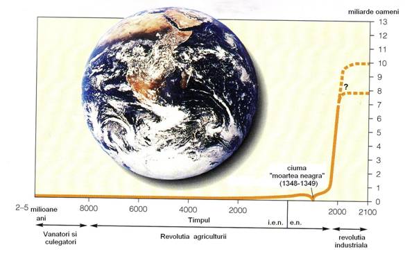 Fig.1-1. Curba-J de ilustrare a cresterii exponentiale a populatiei umane în perioada revolutiei industriale actuale. Prognoza de crestere si în continuare a populatiei implica aspecte complexe în problematica mediului ambiant (dupa Miller 2006).