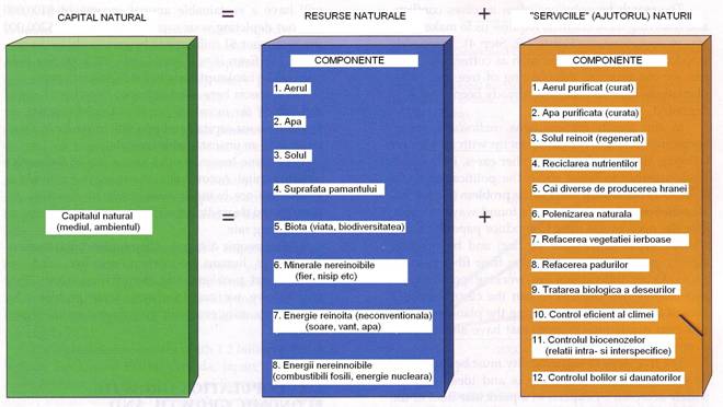 Fig. 1-2. Capitalul natural al Terrei, constituit din resurse naturale si servicii ale naturii. Mentinerea capitalului natural în conditii relativ optime de functionare este esenta actiunilor intreprinse de environmentologie si ecologie pentru sustinerea vietii si functionalitatii ecosistemelor si biocenozelor (schita dupa Miller 2006).