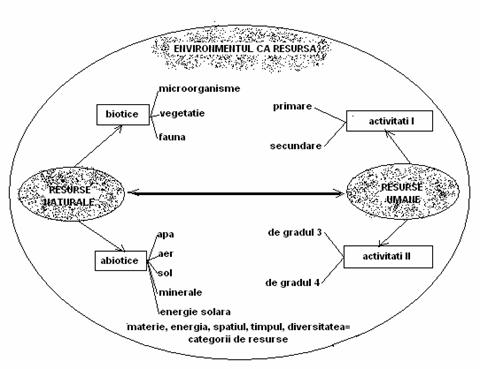 In acceptiunea data mai sus, mediul (environmentul) are caracterul unui sistem cibernetic în care actioneaza factori de reglare si care asigura mentinerea unui echilibru relativ stabil al unei stari create. Environmentul este o structura geospatiala, un ansamblu de componente (abiotice, biotice si antropice), este "ceea ce înconjoara pe om", apreciat ca fiinta superioara, creat pentru a popula si stapâni Pamântul (Mac, 2003). Environmentul este conceput ca o resursǎ, constituit din resurse naturale si resurse umane (Fig. 1-4,b).