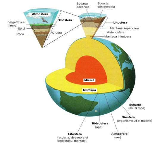 Substratul petrografic si structural. Este o ordonare concentrica pe învelisuri a materiei solide de pe Terra (Fig. 1-5). Trei sunt componentele de structura: scoarta, manta, nucleu (dupa altii, echivalent - litosfera, manta inferioara, nucleu). Litosfera (scoarta + mantaua superioara + mantaua inferioara) are legaturile cele mai strânse cu celelalte geosfere externe (hidrosfera, atmosfera, biosfera, pedosfera, antroposfera).