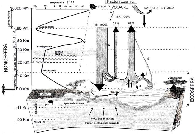 Fig. 1-6. Structura ecosferei si atmosferei, cu reprezentarea fenomenelor care au loc la acest nivel (A) si cu detalierea stratificǎrii pe verticalǎ a atmosferei (B) (dupa Strahler 1973)