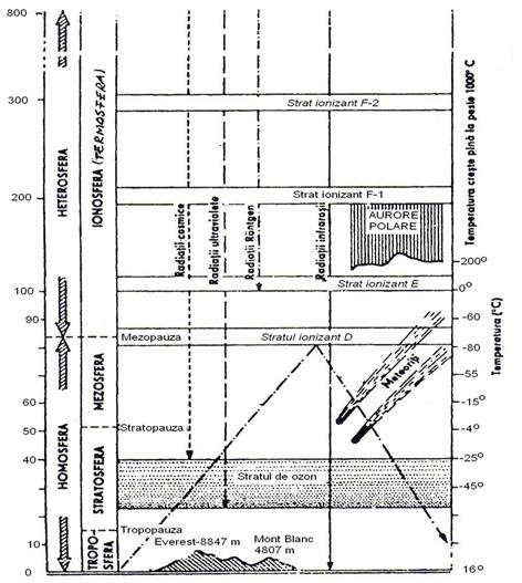 Atmosfera. Structura verticala a atmosferei joase, stratificarea atmosferei, care ne interesaza în mod special (atmosfera geografica, de la suprafata scoartei si pâna la centura de ozon - 30-50 km altitudine), inclusiv ilustrarea zonelor în careeste repartizata biota în mediul acvatic si terestru, sunt reprezentate schematic în Fig. 1-6.