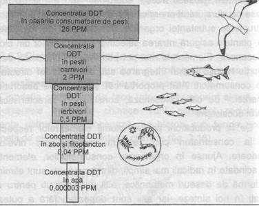 De la producatorii primari atomii elementelor respective trec la consumatori prin reteaua trofica, spre nivelurile superioare. Ajunse în organismul consumatorilor, elementele sunt scindate în radicali mai simpli, dintre care unii sunt eliminati sub forma de deseuri metabolice, altii sunt retinuti pentru a fi utilizati în noi sinteze, iar altii sunt depozitati fara a putea fi eliminati. In procesul de eliminare-retinere, unele elemente realizeaza concentratii crescânde spre nivelurile superioare ale piramidei trofice. Acest proces poarta denumirea de concentrare-acumulare sau amplificare biologica. De exemplu, într-un lant alimentar acvatic cu cinci verigi, concentratia de DDT creste de aproximativ de 10 milioane de ori, acumulându-se în special în tesuturile grase ale organismelor (de la 0,000003 ppm DDT în apa, la 25 ppm în tesuturile pasarilor consumatoare de pesti carnivori (fig. 4).