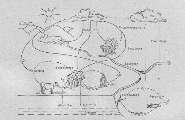 In cursul ciclului sau, apa se deplaseaza în mod neîntrerupt din ocean spre atmosfera: O mare parte a apei de ploaie care ajunge întrr-un ecosistem terestru, se evapora în atmosfera, o alta parte este absorbita de radacinile plantelor, o alta parte este absorbita de radacinile plantelor si reapare în atmosfera prin efectul transpiratiei plantelor; în sfârsit, o alta parte se scurge la suprafata solului sau ajunge în pânza de apa freatica (fig. 9).