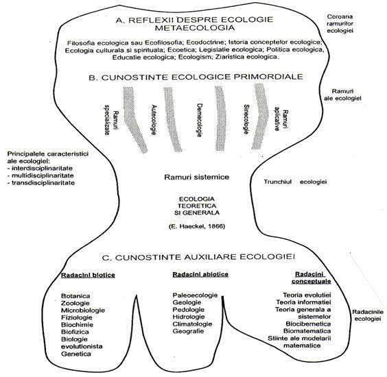 Fig. 2-1. Conceptele ecologiei moderne - caracteristici, principii, discipline. Reprezentare sugestiva sub forma "pomului cunoasterii" (dupa Soran si colab. 1998; Puia si colab. 2001).