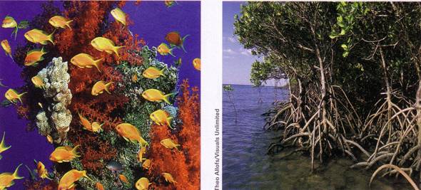 Fig. 1-8. reprezentare sugestiva a environmentului de tip ecosistem: recif coralier (stânga) si mangrove (dreapta) (din Miller 2006). Reciful coralier este o secventa din Marea Rosie; mangrova reprezinta o secventa din Parcul National Daintree, Queensland, Australia.