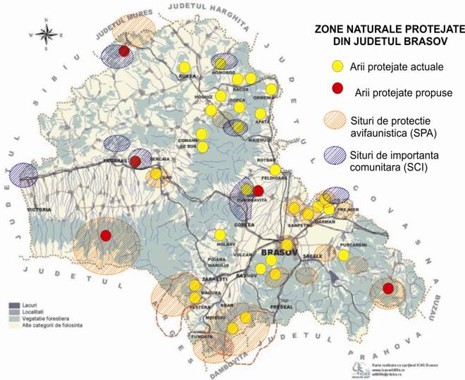 Suprafata ariilor protejate din judet este 28.350,67 ha, reprezentand cca 7% din suprafata Judetului Brasov