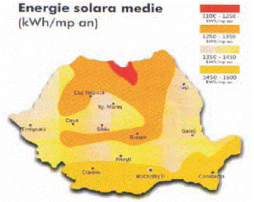 Potentialul de utilizare a energiei solare in Romania este relativ important, exista zone in care fluxul energetic solar anual, ajunge pana la 1450.. 1600 KW/m2/an. In majoritatea regiunilor tarii, fluxul energetic solar anual, depaseste 1250.1350 KW/m2/an.