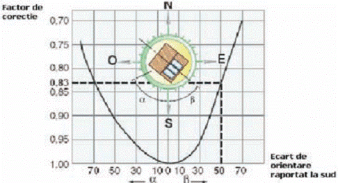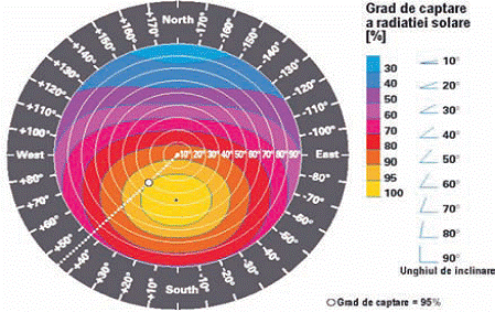 Analizand diagrama, se observa ca unghiul de inclinare optim pentru a capta radiatia solara este de 15- 55°, iar abaterea de la directia Sud, poate sa se situeze intre ± 40° fara a afecta capacita-tea de captare a energiei solare. Chiar si colectori montati vertical, cu o abatere de pana la ±20° fata de sud, pot recupera 80% din radiatia solara. Se poate spune ca orientarea colectorilor solari fata de orizontala si fata de Sud, nu este o problema atat de sensibila.