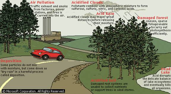 Ploaia acida este formata atunci când emisiile industriale se amesteca cu stratul atmosferic. Poluantii pot fi dusi în nori distante lungi pâna a începe ploaia, ceea ce înseamna ca padurile si lacurile destul de îndepartate de fabrici sau uzine pot fi afectate.