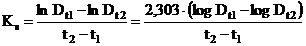 De fapt, se observa ca daca se fac mai multe inregistrari in timp ale deficitului Dt [mg/l] de oxigen dizolvat in apa, mai precis a log Dt, si se reprezinta grafic punctele obtinute intr-un sistem de coordonate cu log Dt pe ordonata si t [h] pe abscisa, atunci coeficientul de absorbtie Ks [h-1] reprezinta panta dreptei trasate printre puncte, multiplicata cu constanta 2,303. Calculul pantei se poate face folosind reprezentarea grafica, prin alegerea a doua puncte 1 si 2, pe dreapta obtinuta, corespunzator carora se exprima log Dt1 si log Dt2, respectiv t1 si t2, sau prin regresie liniara.