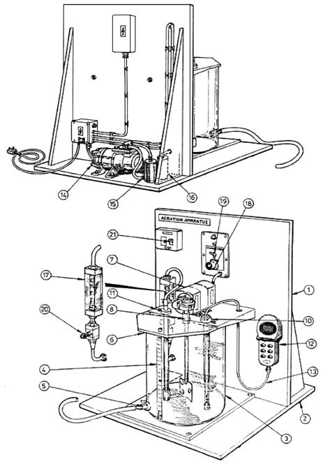 Fig 1 Schema aparatului pentru studiul aerarii (vederi din fata si din spate) [7]