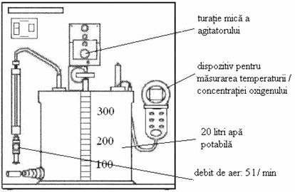 - se aseaza difuzorul de aerare si sonda pentru masurarea cantitatii de oxigen din apa si a temperaturii in pozitii corespunzatoare astfel: difuzorul de aerare se va pozitiona astfel incat curentul de bule de aer obtinut sa nu fie orientat direct catre sonda pentru masurarea cantitatii de oxigen si a temperaturii, pentru ca in caz contrar se vor obtine indicatii false ale aparatului pentru determinarea cantitatii de oxigen dizolvat in apa; sonda pentru masurarea cantitatii de oxigen din apa si a temperaturii se va pozitiona si fixa in pozitie verticala astfel incat inelul argintiu de pe corpul sondei sa fie complet scufundat in lichid;