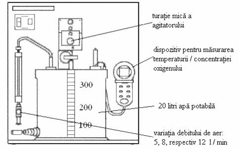 - in timpul experimentelor se vor pune in evidenta influentele principalilor factori de impact asupra fenomenului de transfer a oxigenului in apa, si anume: agitarea apei din aerator, debitul de aer pentru aerare, natura incarcarii poluante a apei uzate, inaltimea coloanei de apa din aerator si tipul constructiv de difuzor pentru aerare. In acest scop se vor efectua masuratori ale marimilor caracteristice fenomenului de aerare a apelor si anume: capacitatea de oxigenare a apei si coeficientul de absorbtie, in situatia in care factorii de impact variaza intre anumite limite; pe baza masuratorilor efectuate se vor ridica curbe specifice procesului de aerare.