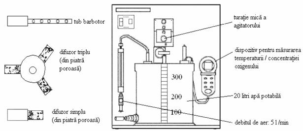 - se repeta experimentul, inlocuindu-se difuzorul simplu de aerare din material poros cu un difuzor triplu de aerare din material poros si se vor determina si in acest caz valorile coeficientului de absorbtie Ks si a capacitatii R(10) de oxigenare a apei la temperatura de 10sC;