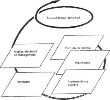 Acest standard international stabileste cerintele pentru un astfel de sistem de management de mediu care sa permita unei organizatii sa dezvolte si sa implementeze o politica si obiective care iau Ih considerare cerinte legale si informati despre aspectele semnificative de mediu. Acesta a fost elaborat pentru a putea fi aplicat tuturor organizatiilor, de orice tip si marime, si de a fi adaptat diverselor concfitii geografice, culturale si sociale. Baza acestei abordari este reprezentata fn figura 1. Succesul sistemului depinde de angajamentul asumat la toate nivelurile si functiile organizatiei, Ih special, la nivelul cel mai ridicat al managementului organizatiei. Un sistem de acest tip permite unei organizatii sa elaboreze o politica de mediu, sa stabileasca obiective si procese pentru a ndeplini angajamentele politicii sa ntreprinda actiunile necesare pentru a-si mbunatati performantele si pentru a demonstra conformitatea sistemului cu cerintele acestui standard international. Scopul general al acestui standard international este de a sustine protectia mediului si de a preveni poluarea, n echilibru cu necesitatile socio-economice. Ar trebui mentionat faptul ca pot fi abordate simultan mai multe cerinte sau pot fi reconsiderate n orice moment