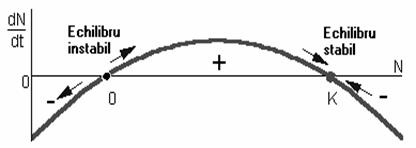 Daca vom īncerca sa observam stabilitatea a doua puncte de echilibru īn modelul logistic atunci trebuie sa interpretam graficul din figura 51, īn care este reprezentata rata cresterii populatiei īn functie de densitatea populatiei. Daca 0 < N < k, atunci, populatia creste si īn grafic se poate observa o deplasare a punctului de echilibru spre dreapta. Daca N > k, atunci populatia descreste si se observa tendinta de deplasare a punctului de echilibru spre stānga. Se observa ca pentru valoarea N = 0 echilibrul este instabil, īn timp ce pentru N = k, echilibrul este stabil.