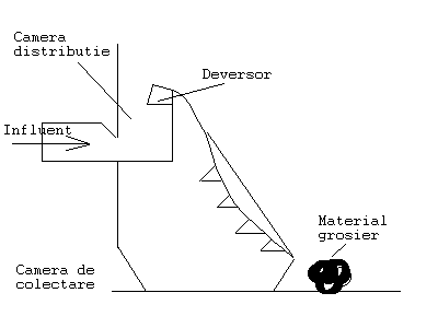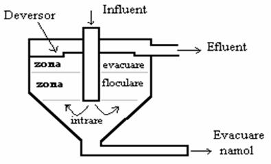 a) separarea gravitationala a particulelor grosiere, nedizolvate in apa, sub influenta campului gravitational al Pamantului, prin sedimentare, prin flotatie sau prin centrifugare. Este posibil fenomenul de aglomerare (floconare), flocoanele avand mase mai mari si care sedimenteaza mai repede. Ca exemplu se prezinta fig. 1.1, un decantor, care poate fi cu curgere a apei verticala si orizontala. Eliminarea namolului din decantor se poate face manual si intermitent. Dupa forma, decantoarele pot fi circulare si rectangulare. Evacuarea apei limpezite se face prin deversoare.