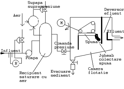 b) flotatia este un proces unitar de separare din apa, sub actiunea campului gravitational terestru, a particulelor cu densitate medie mai mica decat a fi naturala sau cu aer introdus in apa sub forma de bule fine prin difuzoare poroase. Scopul flotatiei este de a forma o spuma stabila care sa incorporeze particulele insolubile. Flotatia se poate face se poate face in bazine circulare sau dreptunghiulare. In fig. 1.2 se prezinta schema unei instalatii de flotatie cu aer sub presiune.