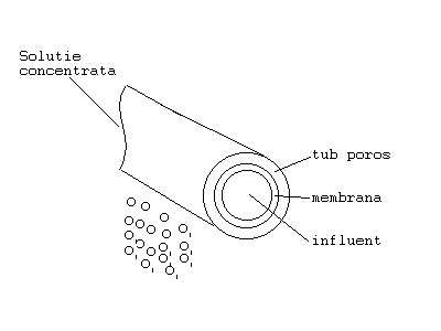 f) epurarea prin membrane. Membrana este o bariera pentru speciile moleculare sau ionice prezente in curentul de apa care o strabate. Ca materiale pentru membrane se folosesc acetatul de celuloza, materiale polimerice stabile in timp (poliamide, polisuflone, etc.). Procesul de epurare cu membrane se numeste osmoza, care poate fi directa sau inversa, in functie de directia apei de la o solutie diluata la una concentrata sau invers. Pot exista mai multe tipuri de module de osmoza, ca de exemplu tubulare, fig. 1.4.