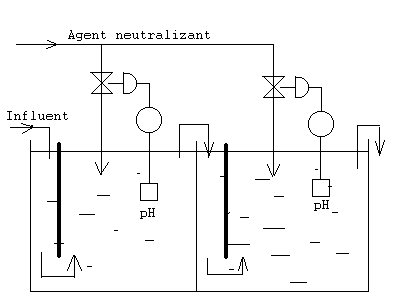 Neutralizarea apelor alcaline se face cu acizi reziduali, cu gazele de ardere bogate in CO2 (14%) etc. Deoarece influentii au debite variabile in timp, este necesara o bucla de reglare a pH, marind debitul de agent neutralizant, fig. 1.6.