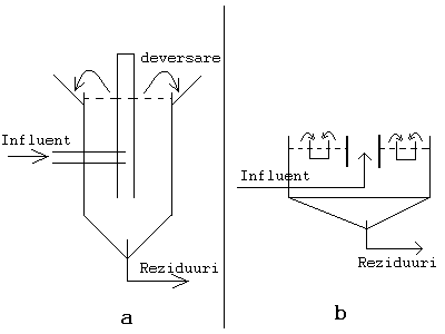 b) Modelele mecanice inlatura materia in unul sau mai multe trepte, folosind gratare, camere cu nisip, sedimentare, filtrare, flotare. Ca exemple, in fig. 1.7.a,b se dau doua tipuri de vase de sedimentare, primul pentru debite mici, al doilea pentru debite mari.