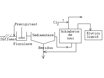 In fig.. 1.8. se da un exemplu de combinare a metodelor precipitarii chimice si a schimbului de ioni pentru tratare apelor uzate din industria alimentara, de exemplu un abator.