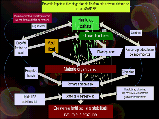 refacerea materiei organice din sol prin acumularea glomalinei excretate de ciupercile din simbiozele endomicorizale pe seama exsudatele radiculare (prin care plantele transloca pâna la 40% din bioxidul de carbon fixat fotosintetic);
