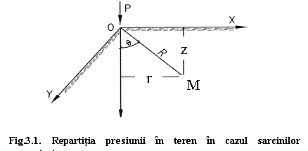 Se considera planele xOy si xOz, fig.3.1, si o sarcina concentrata P care actioneaza in originea O, la suprafata terenului, si vom determina eforturile distribuite intr-un punct M situat in interiorul terenului de fundare, pentru care se cunosc coordonatele R si q, respectiv r si z.