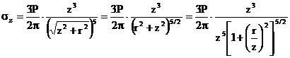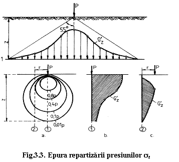 Din relatiile 3.3 si 3.4 se constata ca marimea presiunii repartizate scade odata cu cresterea adancimii. Daca punctul M se afla la o oarecare distanta r de verticala pe care actioneaza forta P, presiunea sz scade deoarece factorul de influenta Is este mai mic. Modul de variatie al presiunii sz este prezentat in figura 3.3.